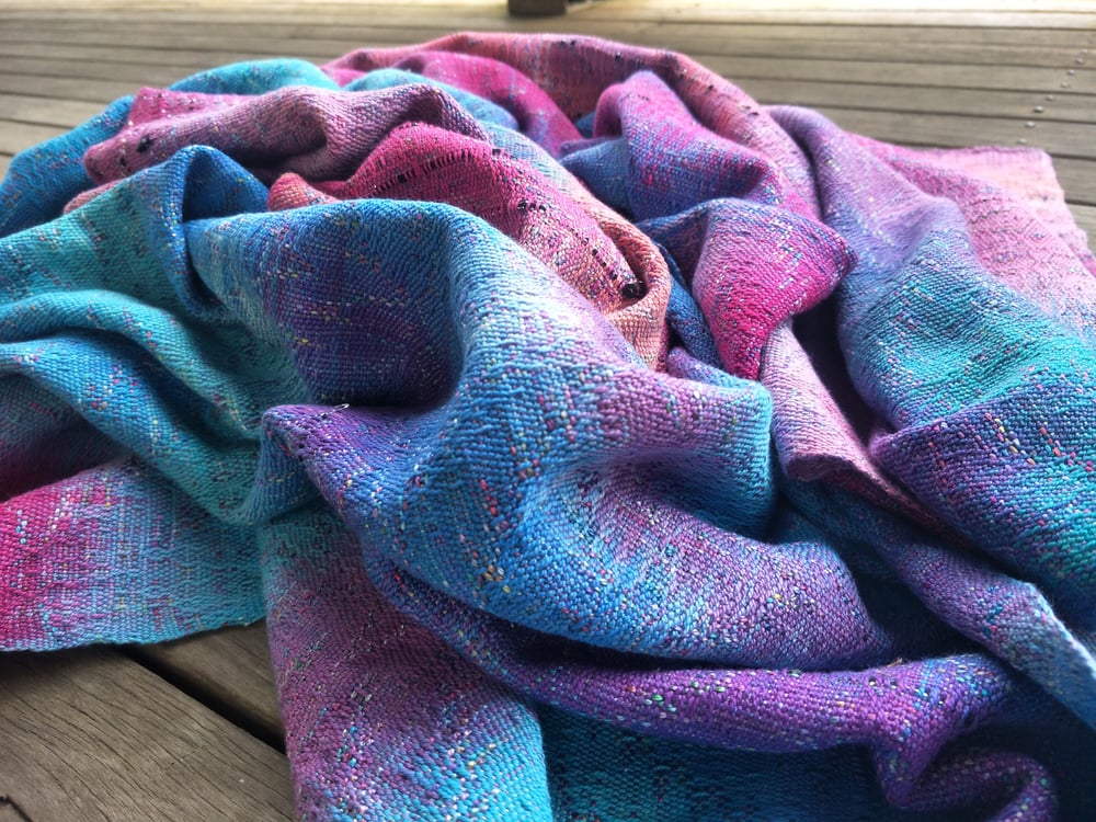 This gorgeous ready to wear piece of "Don't be jelly" is 3.3m long STIH measurement. its hemmed and has stunning Black Egyptian cotton and sparkle thread inlays throughout. Warp is the amazingly soft but durable long staple Egyptian cotton and the Weft is the luxuriously soft Swiss silk and has been speckle dyed in rainbow colours to create a lovely variegated weft and subtle breakup of warp colours.